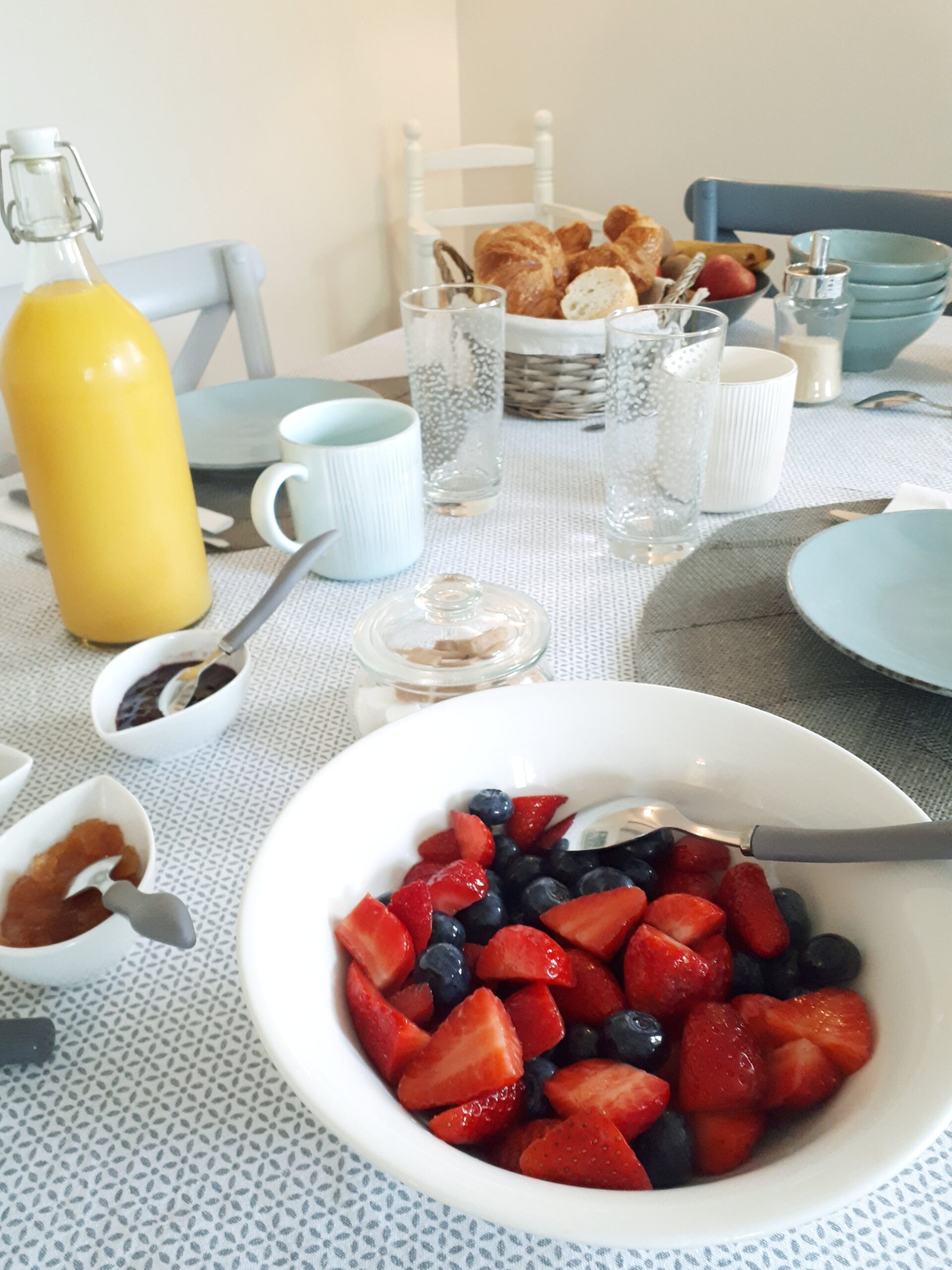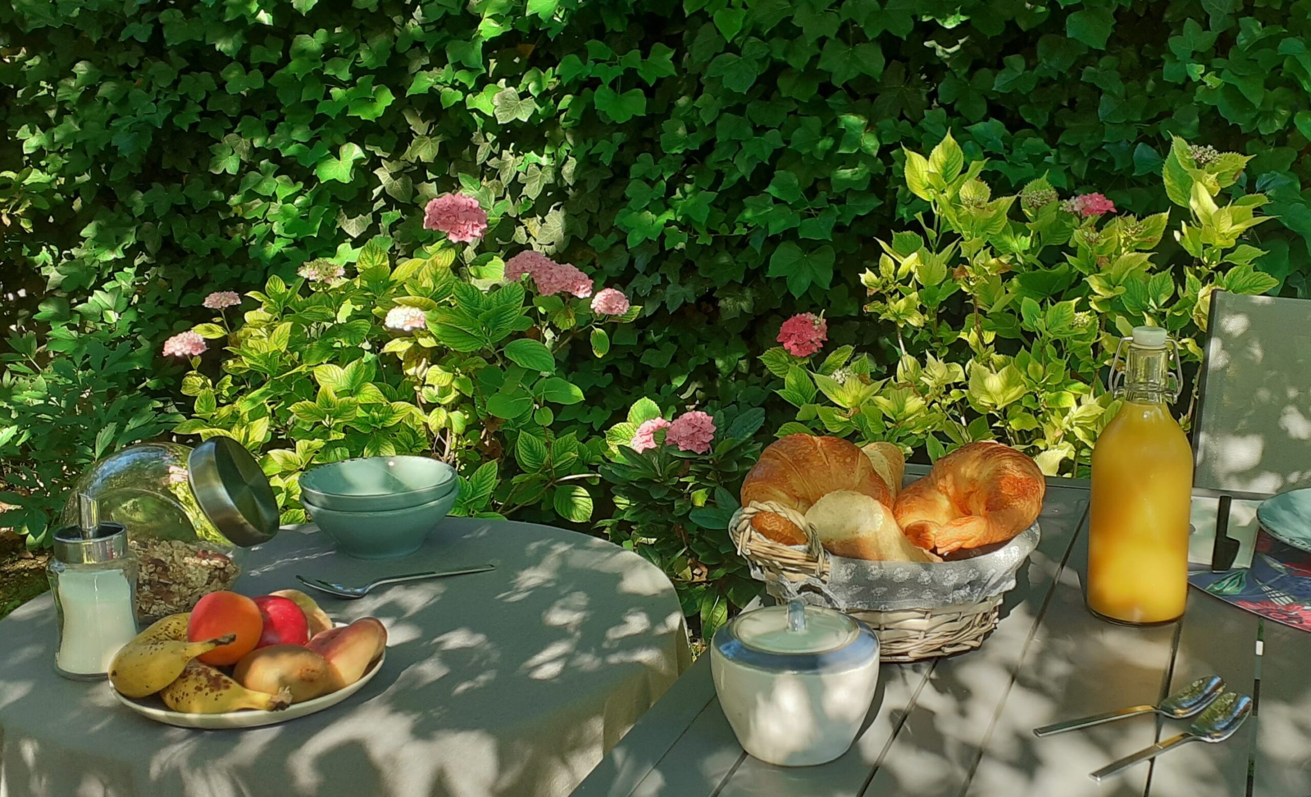 Les petits déjeuners sont servis dans le salon bibliothèque ou à l’extérieur avec des produits frais et faits maison. Les confitures viennent des fruits du jardin ; fraises-rhubarbes, griottes, gelée de coings, gelée pommes vanillées, ….