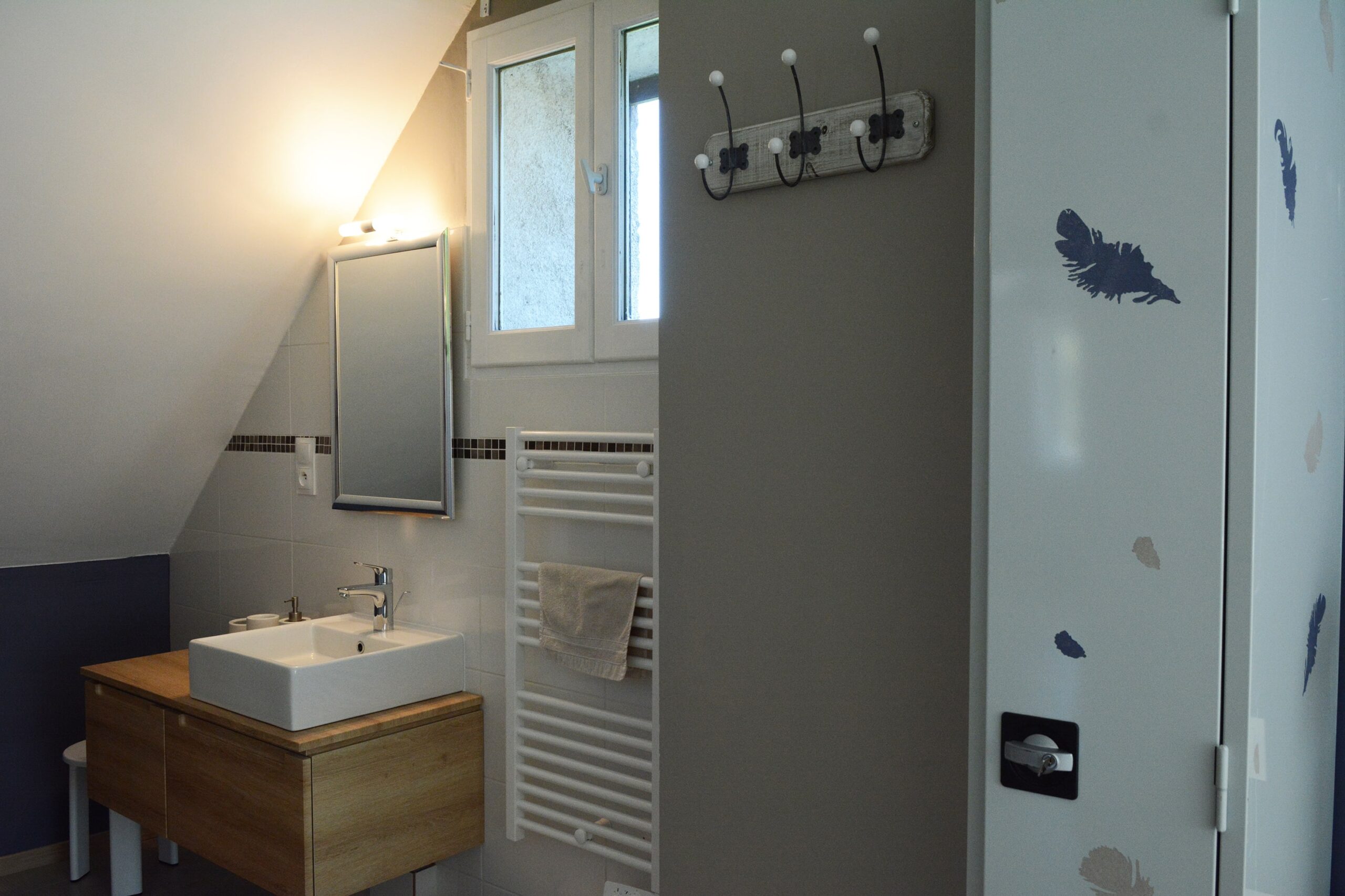 Salle de bain fermée et équipée d’une grande douche, d’un radiateur sèche-serviette, d’un sèche-cheveux et nombreux rangements. Gel lavant corps et cheveux de la marque Coslys, produit d’origine naturelle et respectueux de l’environnement.