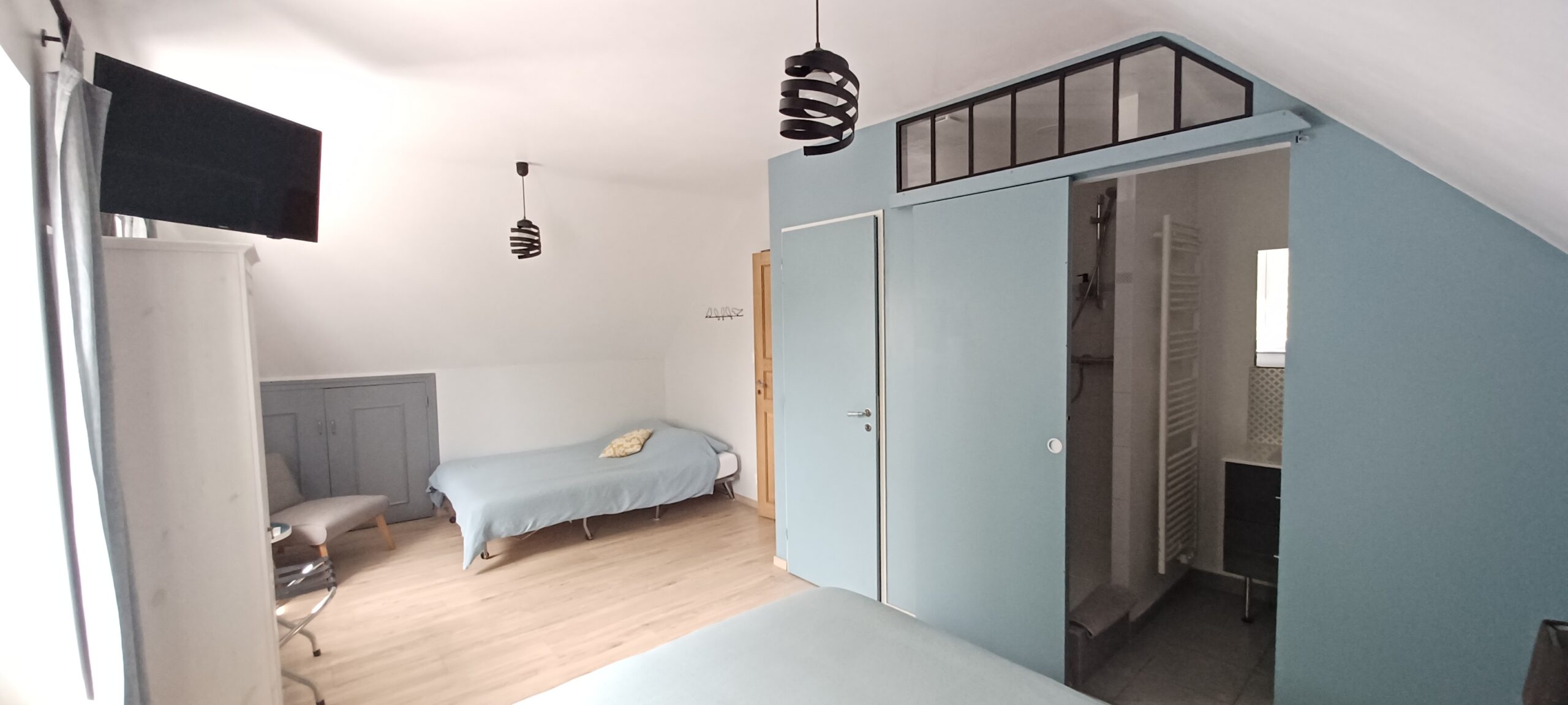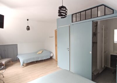 Salle de bain ouverte sur la chambre, équipée d’une grande douche, d’un radiateur sèche-serviette et d’un sèche-cheveux. Gel lavant corps et cheveux de la marque Coslys, produit d’origine naturelle et respectueux de l’environnement.